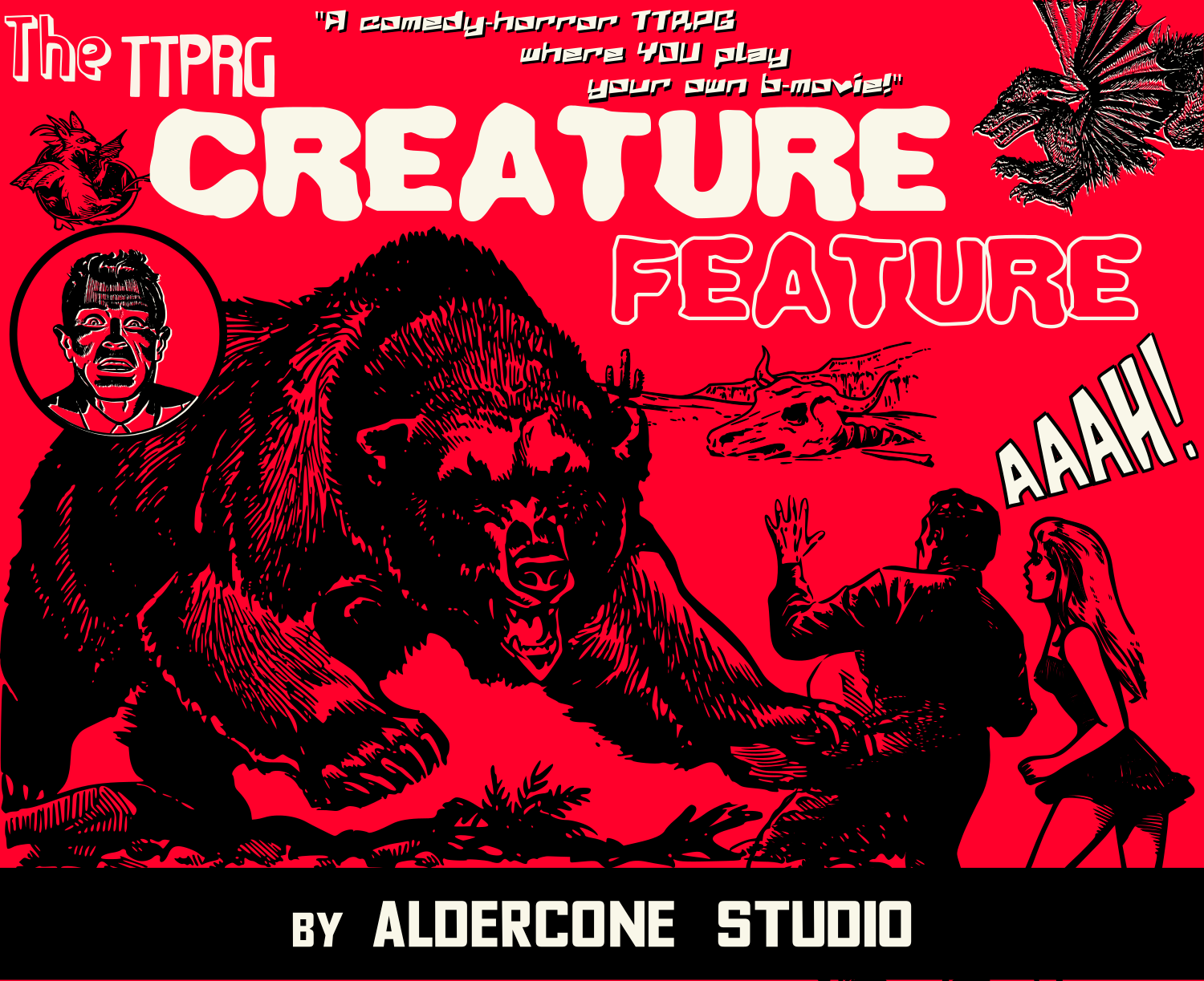 Creature Feature is a one-shot comedy-horror TTRPG inspired by monster b-movies. Guided by the Storyteller, 2 to 5 players cooperatively play out a string of scenes, affected by the players actions, and ending in a thrilling climax! This is a story-telling heavy game with simple mechanics to guide the ebb and flow. Characters, Creatures, and Settings are based on simple yet dynamic archetypes from horror films.